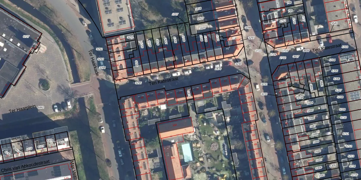 Het perceel waarop Ten Katestraat 12 staat heeft een oppervlakte van 4800 m². Dit is een zeer groot perceel. De perceeloppervlakte wordt geregistreerd door het Kadaster. Gedetailleerde informatie over de maten van dit perceel kunt u vinden in het rapport Kadastrale kaart met maatvoering van Ten Katestraat 12.