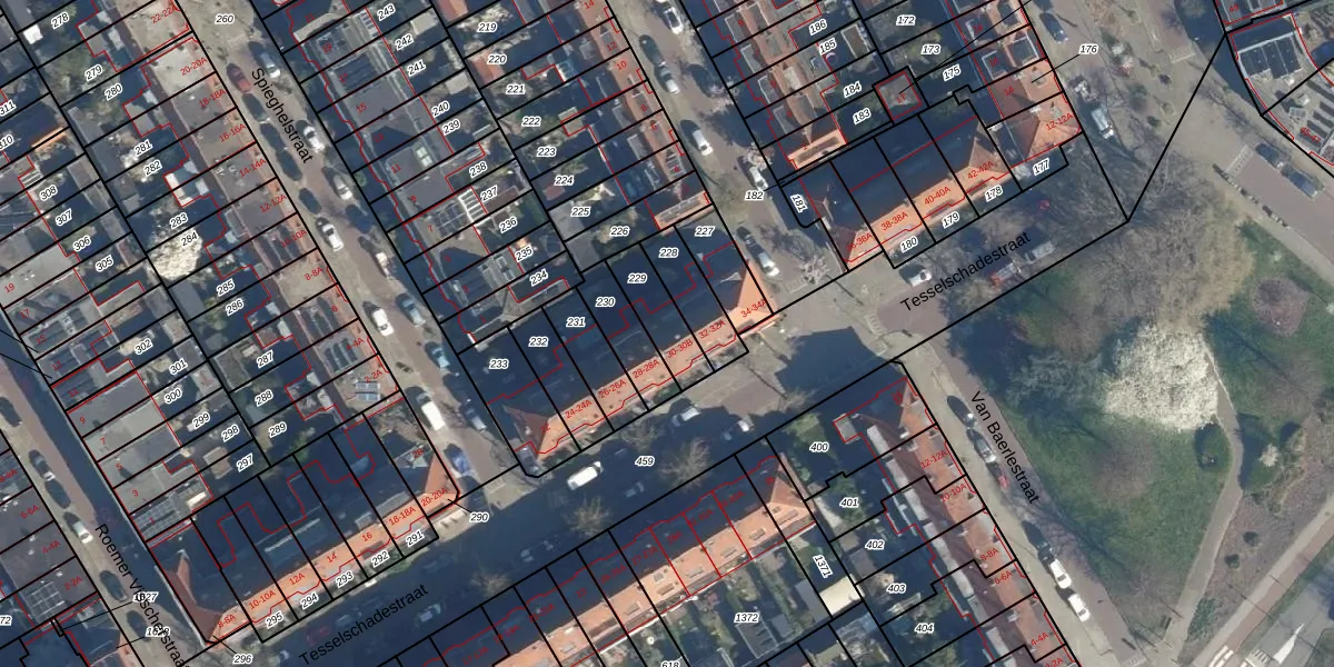 Het perceel waarop Tesselschadestraat 30-A staat heeft een oppervlakte van 132 m². Dit is een middelgroot perceel. De perceeloppervlakte wordt geregistreerd door het Kadaster. Gedetailleerde informatie over de maten van dit perceel kunt u vinden in het rapport Kadastrale kaart met maatvoering van Tesselschadestraat 30-A.