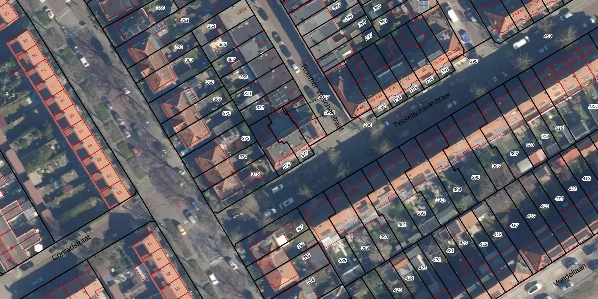 Het perceel waarop Tesselschadestraat 4 staat heeft een oppervlakte van 127 m². Dit is een middelgroot perceel. De perceeloppervlakte wordt geregistreerd door het Kadaster. Gedetailleerde informatie over de maten van dit perceel kunt u vinden in het rapport Kadastrale kaart met maatvoering van Tesselschadestraat 4.
