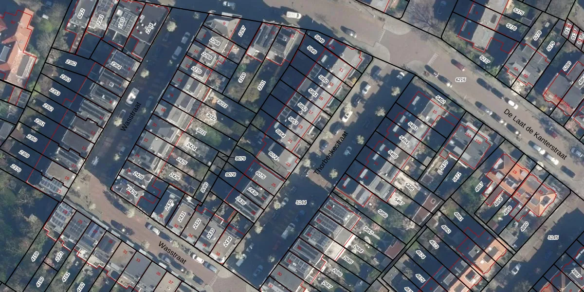 Thorbeckestraat 21 is gelegen op kadastraal perceel LDN01M5854. Deze kadastrale aanduiding is uniek en wordt gebruikt door het Kadaster om eigendomsrechten en andere zakelijke rechten vast te leggen. Het perceel maakt onderdeel uit van de kadastrale gemeente Leiden.