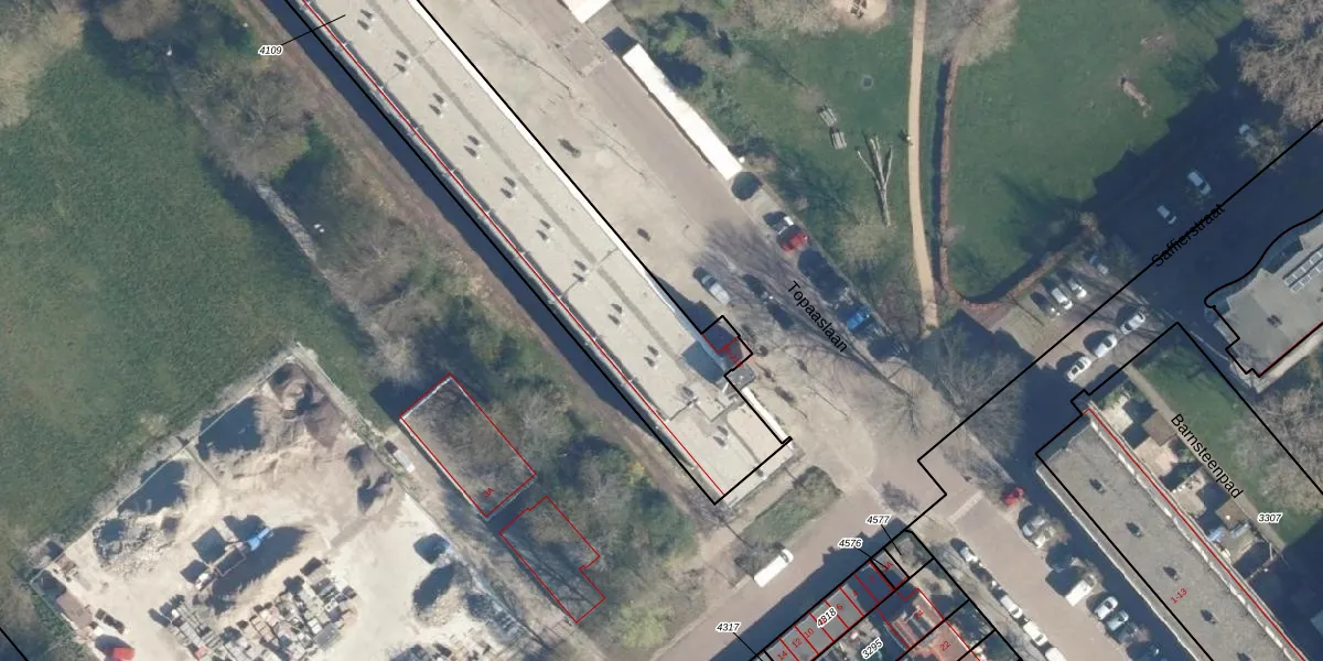 Het perceel waarop Topaaslaan 104 staat heeft een oppervlakte van 2015 m². Dit is een zeer groot perceel. De perceeloppervlakte wordt geregistreerd door het Kadaster. Gedetailleerde informatie over de maten van dit perceel kunt u vinden in het rapport Kadastrale kaart met maatvoering van Topaaslaan 104.