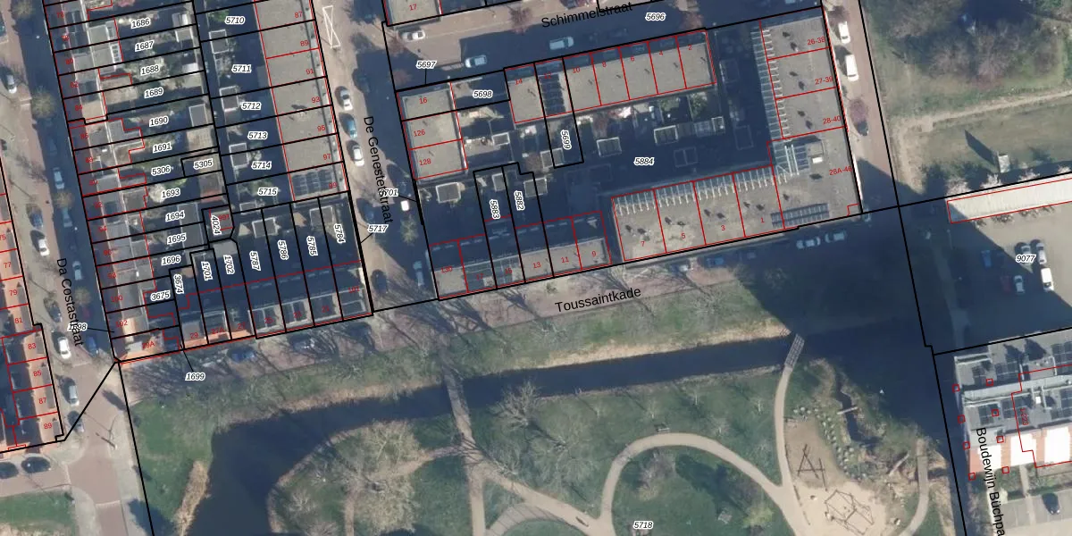 Het perceel waarop Toussaintkade 13 staat heeft een oppervlakte van 115 m². Dit is een middelgroot perceel. De perceeloppervlakte wordt geregistreerd door het Kadaster. Gedetailleerde informatie over de maten van dit perceel kunt u vinden in het rapport Kadastrale kaart met maatvoering van Toussaintkade 13.