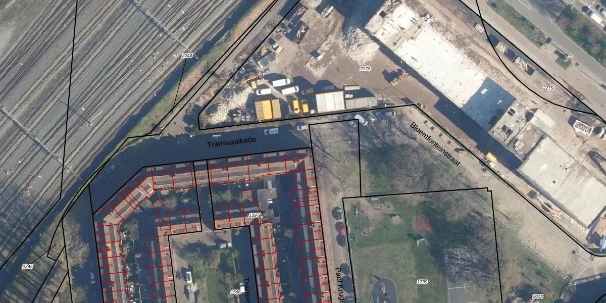 Het perceel waarop Transvaalkade 1 staat heeft een oppervlakte van 2410 m². Dit is een zeer groot perceel. De perceeloppervlakte wordt geregistreerd door het Kadaster. Gedetailleerde informatie over de maten van dit perceel kunt u vinden in het rapport Kadastrale kaart met maatvoering van Transvaalkade 1.