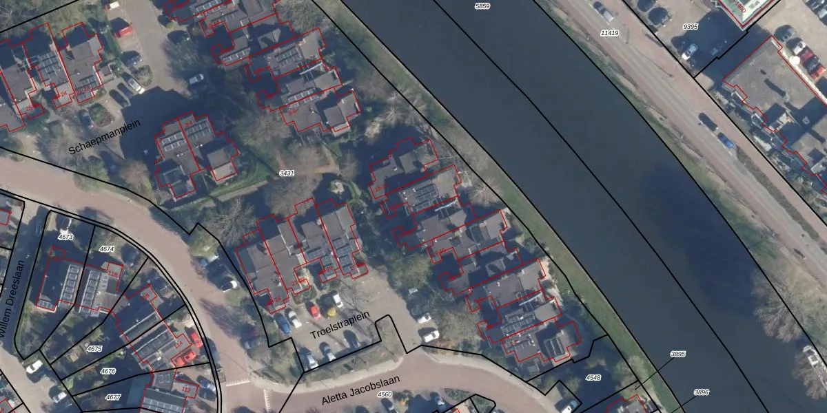 Het perceel waarop Troelstraplein 14 staat heeft een oppervlakte van 8450 m². Dit is een zeer groot perceel. De perceeloppervlakte wordt geregistreerd door het Kadaster. Gedetailleerde informatie over de maten van dit perceel kunt u vinden in het rapport Kadastrale kaart met maatvoering van Troelstraplein 14.