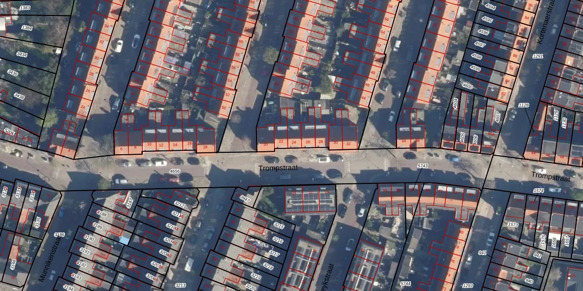 Het perceel waarop Trompstraat 24 staat heeft een oppervlakte van 4030 m². Dit is een zeer groot perceel. De perceeloppervlakte wordt geregistreerd door het Kadaster. Gedetailleerde informatie over de maten van dit perceel kunt u vinden in het rapport Kadastrale kaart met maatvoering van Trompstraat 24.