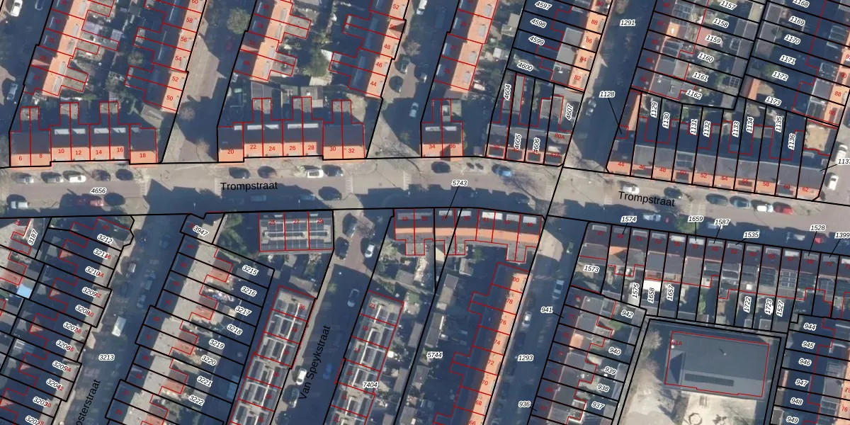 Het perceel waarop Trompstraat 35 staat heeft een oppervlakte van 1265 m². Dit is een zeer groot perceel. De perceeloppervlakte wordt geregistreerd door het Kadaster. Gedetailleerde informatie over de maten van dit perceel kunt u vinden in het rapport Kadastrale kaart met maatvoering van Trompstraat 35.