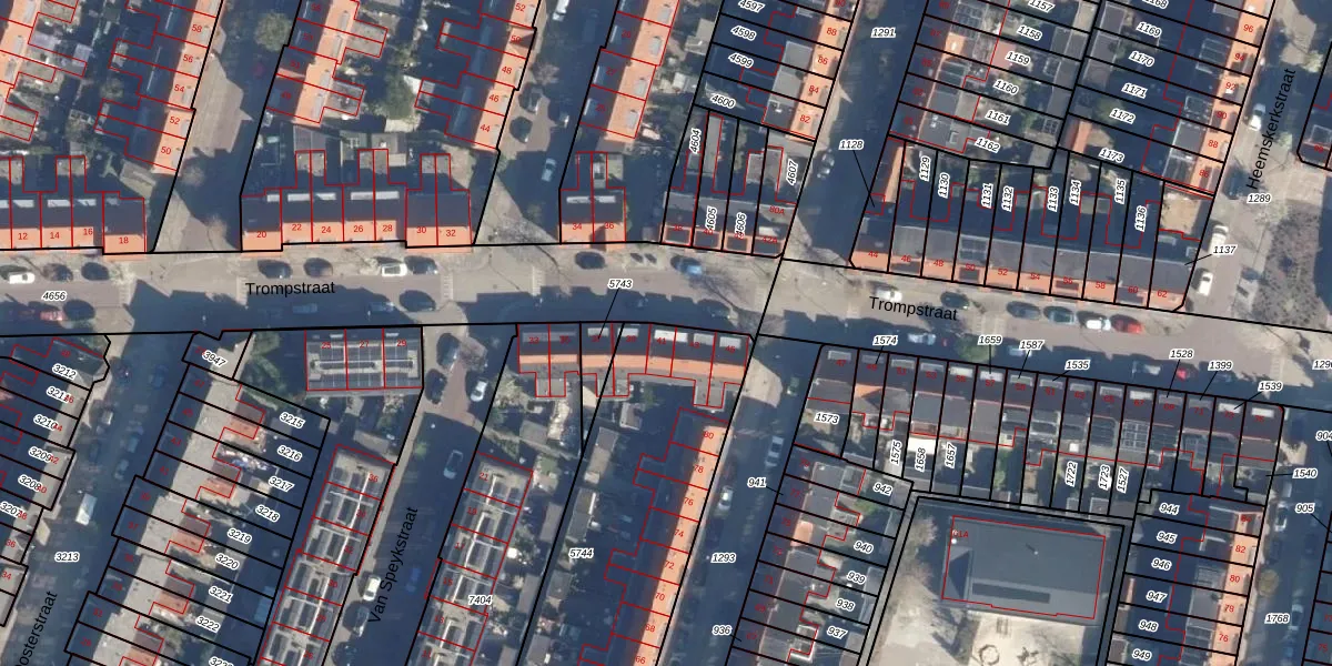 Het perceel waarop Trompstraat 41 staat heeft een oppervlakte van 1701 m². Dit is een zeer groot perceel. De perceeloppervlakte wordt geregistreerd door het Kadaster. Gedetailleerde informatie over de maten van dit perceel kunt u vinden in het rapport Kadastrale kaart met maatvoering van Trompstraat 41.