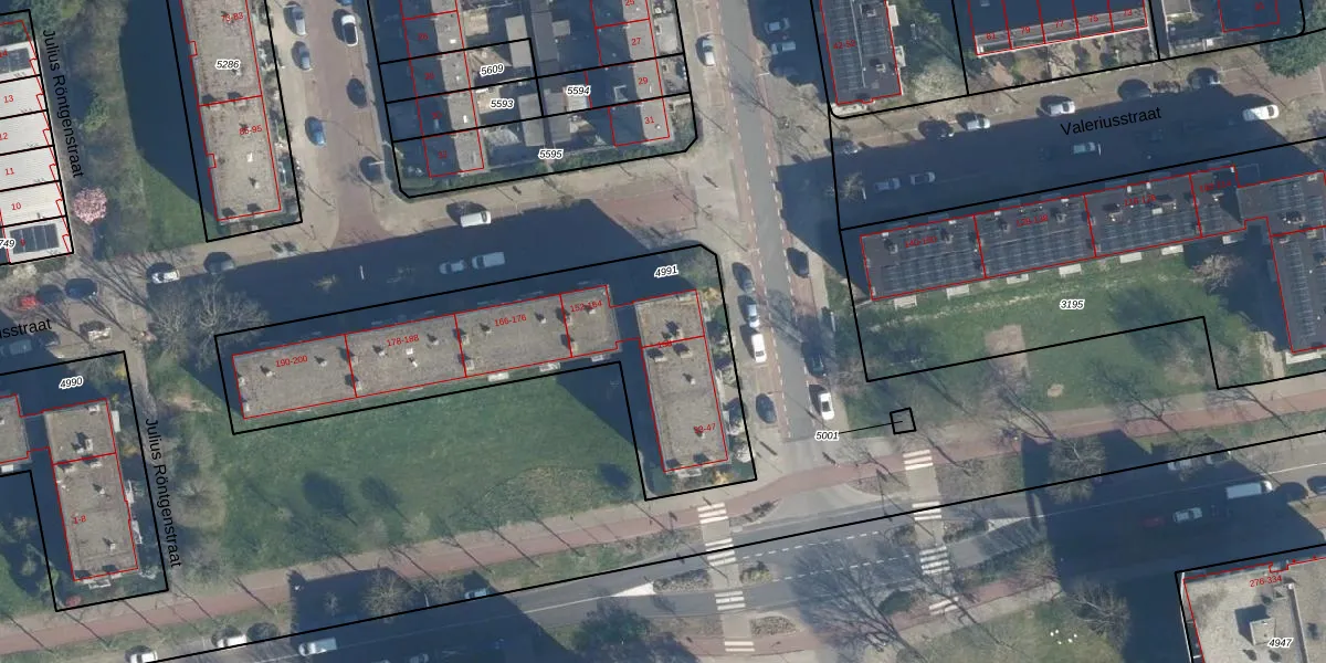 Valeriusstraat 156 is gelegen op kadastraal perceel LDN01O4991. Deze kadastrale aanduiding is uniek en wordt gebruikt door het Kadaster om eigendomsrechten en andere zakelijke rechten vast te leggen. Het perceel maakt onderdeel uit van de kadastrale gemeente Leiden.