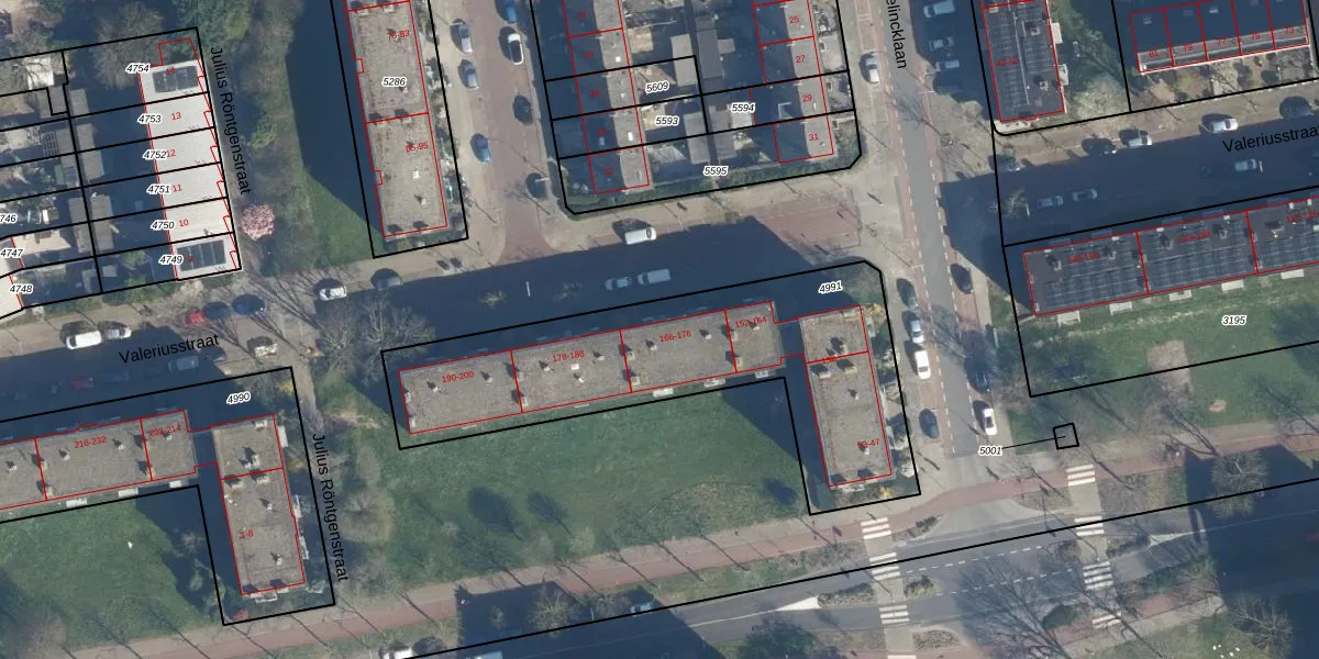 Valeriusstraat 172 is gelegen op kadastraal perceel LDN01O4991. Deze kadastrale aanduiding is uniek en wordt gebruikt door het Kadaster om eigendomsrechten en andere zakelijke rechten vast te leggen. Het perceel maakt onderdeel uit van de kadastrale gemeente Leiden.