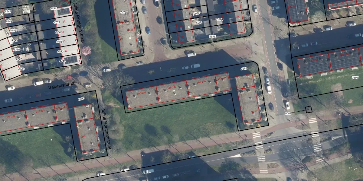 Valeriusstraat 182 is gelegen op kadastraal perceel LDN01O4991. Deze kadastrale aanduiding is uniek en wordt gebruikt door het Kadaster om eigendomsrechten en andere zakelijke rechten vast te leggen. Het perceel maakt onderdeel uit van de kadastrale gemeente Leiden.