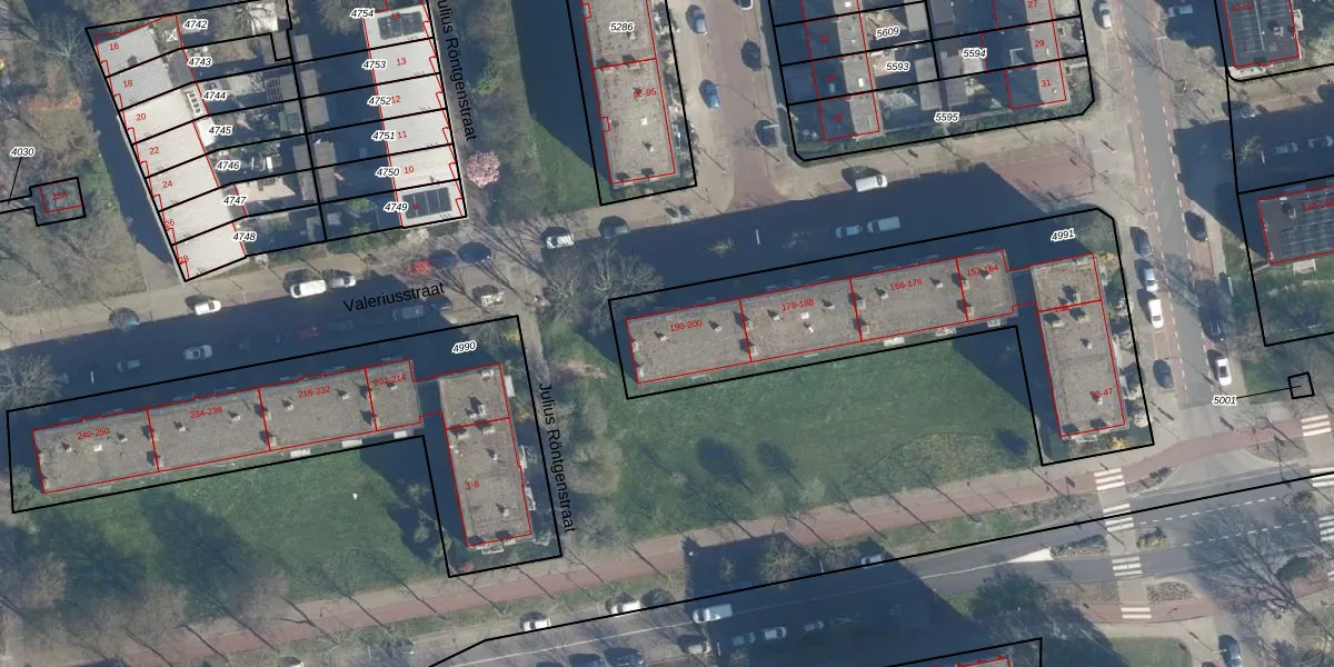 Valeriusstraat 198 is gelegen op kadastraal perceel LDN01O4991. Deze kadastrale aanduiding is uniek en wordt gebruikt door het Kadaster om eigendomsrechten en andere zakelijke rechten vast te leggen. Het perceel maakt onderdeel uit van de kadastrale gemeente Leiden.