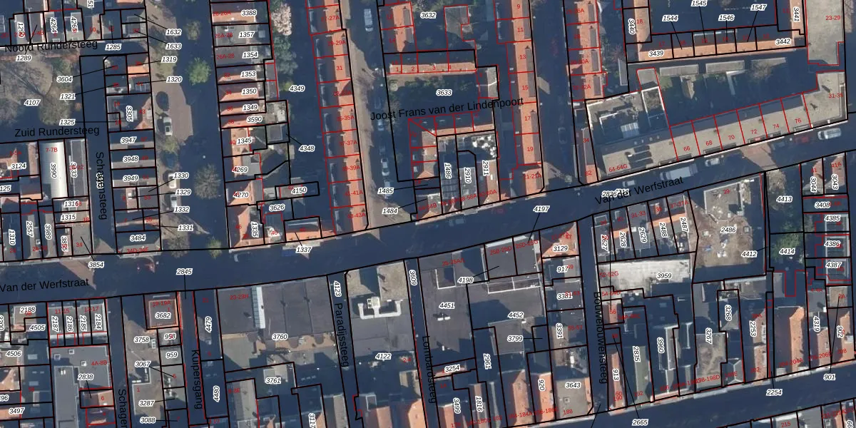 Van der Werfstraat 54 is gelegen op kadastraal perceel LDN01H1484. Deze kadastrale aanduiding is uniek en wordt gebruikt door het Kadaster om eigendomsrechten en andere zakelijke rechten vast te leggen. Het perceel maakt onderdeel uit van de kadastrale gemeente Leiden.