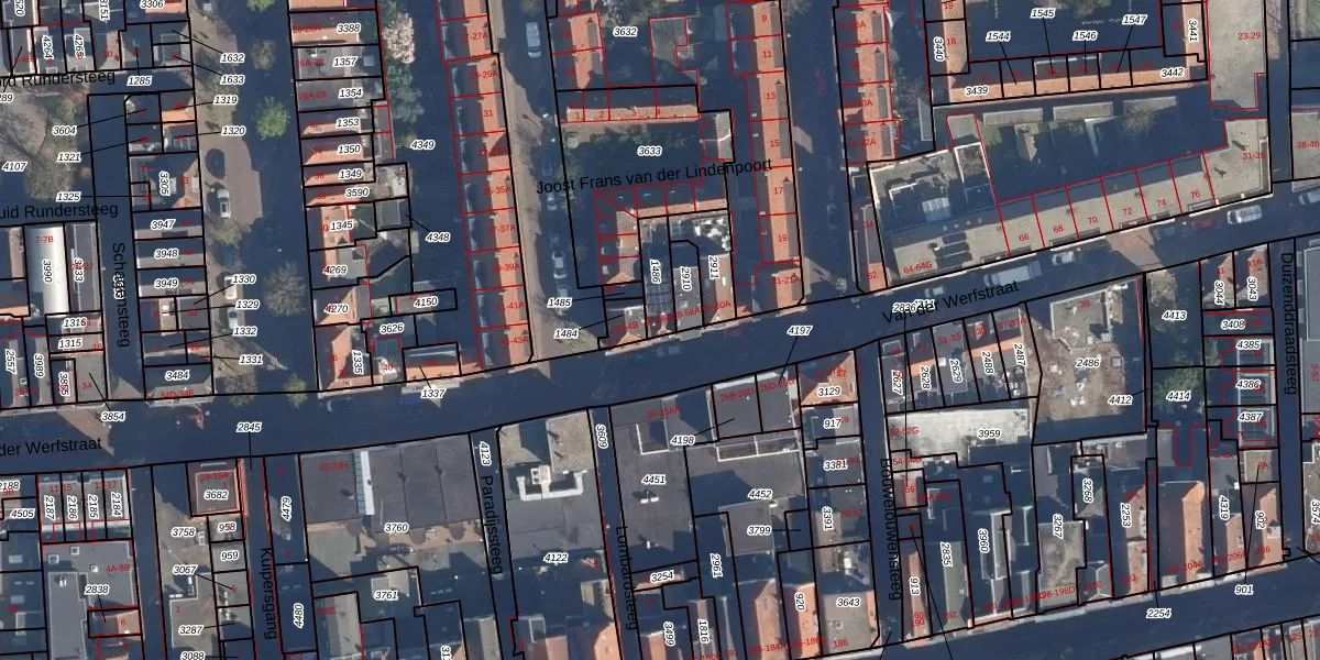 Van der Werfstraat 56 is gelegen op kadastraal perceel LDN01H1486. Deze kadastrale aanduiding is uniek en wordt gebruikt door het Kadaster om eigendomsrechten en andere zakelijke rechten vast te leggen. Het perceel maakt onderdeel uit van de kadastrale gemeente Leiden.