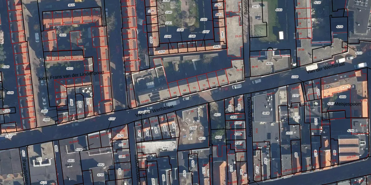 Van der Werfstraat 68 is gelegen op kadastraal perceel LDN01H4207. Deze kadastrale aanduiding is uniek en wordt gebruikt door het Kadaster om eigendomsrechten en andere zakelijke rechten vast te leggen. Het perceel maakt onderdeel uit van de kadastrale gemeente Leiden.