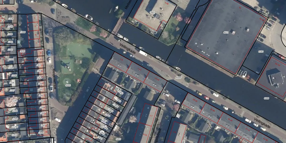 Veilingkade 11 is gelegen op kadastraal perceel LDN01O5003. Deze kadastrale aanduiding is uniek en wordt gebruikt door het Kadaster om eigendomsrechten en andere zakelijke rechten vast te leggen. Het perceel maakt onderdeel uit van de kadastrale gemeente Leiden.