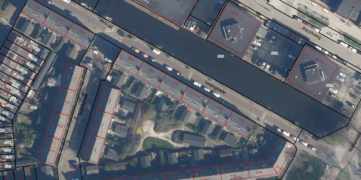 Veilingkade 36 is gelegen op kadastraal perceel LDN01O4977. Deze kadastrale aanduiding is uniek en wordt gebruikt door het Kadaster om eigendomsrechten en andere zakelijke rechten vast te leggen. Het perceel maakt onderdeel uit van de kadastrale gemeente Leiden.