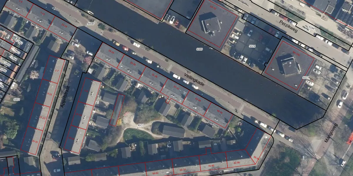Veilingkade 38 is gelegen op kadastraal perceel LDN01O4977. Deze kadastrale aanduiding is uniek en wordt gebruikt door het Kadaster om eigendomsrechten en andere zakelijke rechten vast te leggen. Het perceel maakt onderdeel uit van de kadastrale gemeente Leiden.