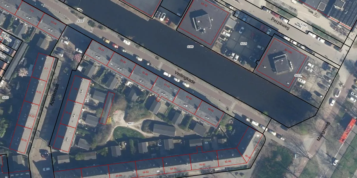 Het perceel waarop Veilingkade 40 staat heeft een oppervlakte van 6225 m². Dit is een zeer groot perceel. De perceeloppervlakte wordt geregistreerd door het Kadaster. Gedetailleerde informatie over de maten van dit perceel kunt u vinden in het rapport Kadastrale kaart met maatvoering van Veilingkade 40.