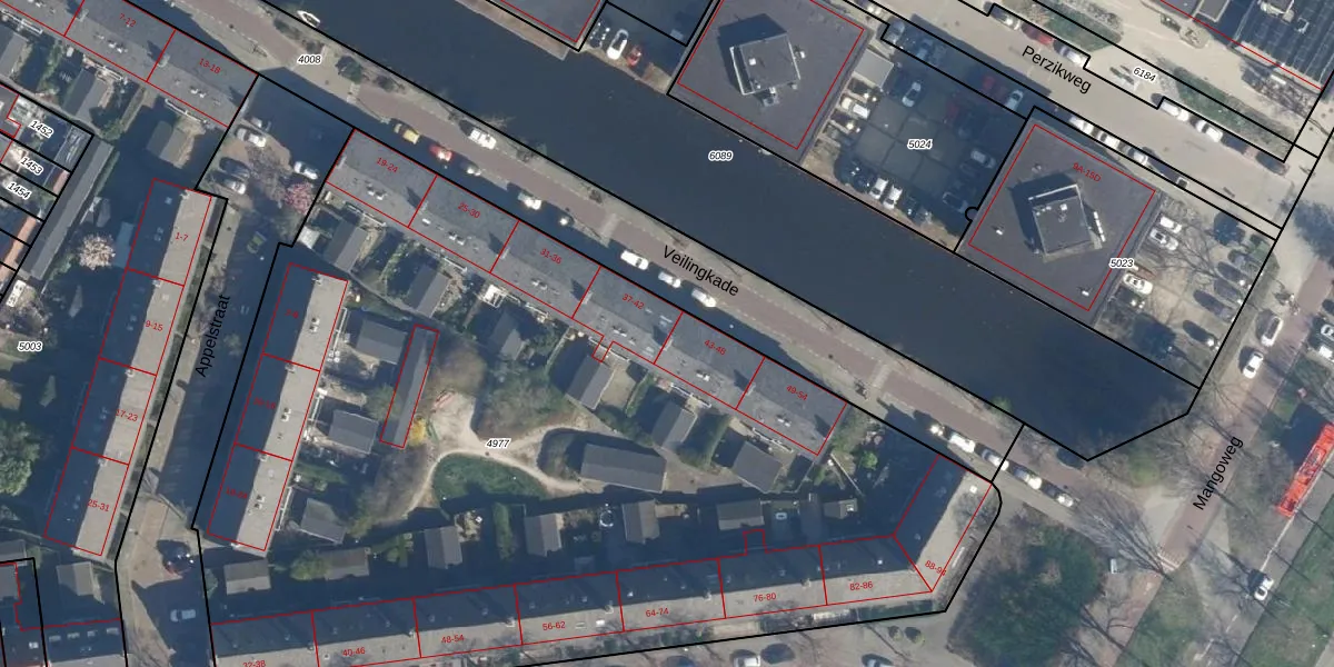 Veilingkade 42 is gelegen op kadastraal perceel LDN01O4977. Deze kadastrale aanduiding is uniek en wordt gebruikt door het Kadaster om eigendomsrechten en andere zakelijke rechten vast te leggen. Het perceel maakt onderdeel uit van de kadastrale gemeente Leiden.