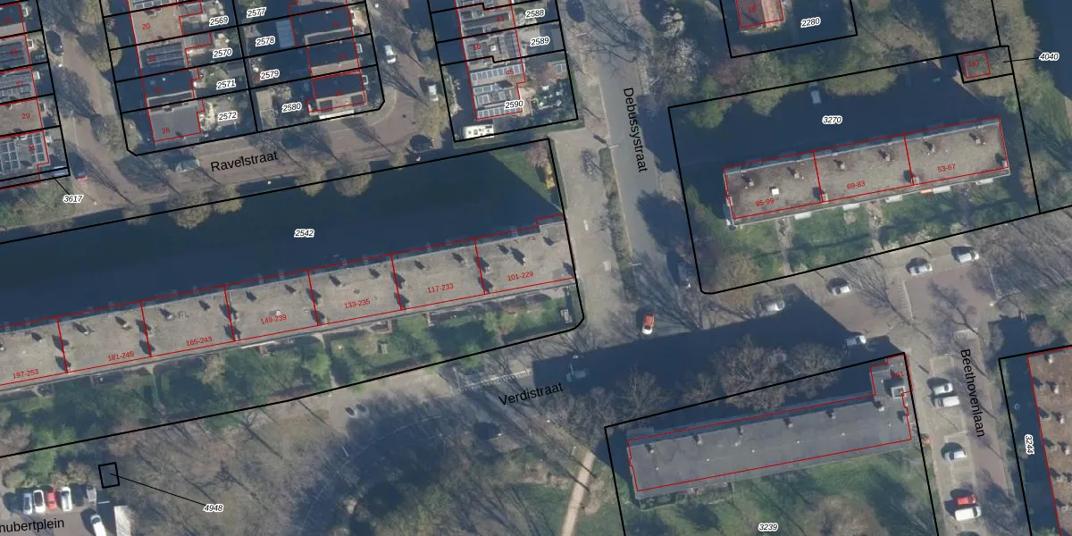 Verdistraat 103 is gelegen op kadastraal perceel LDN01O2542. Deze kadastrale aanduiding is uniek en wordt gebruikt door het Kadaster om eigendomsrechten en andere zakelijke rechten vast te leggen. Het perceel maakt onderdeel uit van de kadastrale gemeente Leiden.