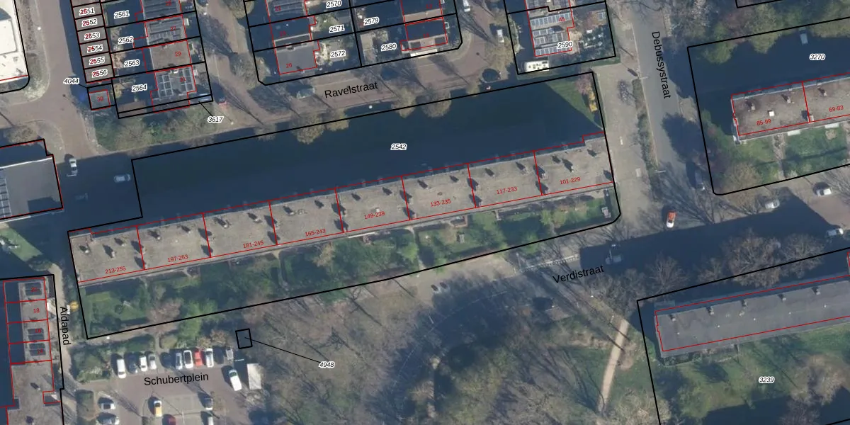 Het perceel waarop het adres ligt is LDN01-O-2542. De afkorting 'LDN01' staat voor kadastrale gemeente Leiden. De oppervlakte van het perceel is 4713 m². Dat is groter dan gemiddeld in Leiden, waar de gemiddelde perceeloppervlakte op 703,94 m² ligt. De grootste perceeloppervlakte in de kadastrale gemeente is 51,8 ha. De kleinste oppervlakte bedraagt 0 m². Op het perceel liggen in totaal 78 adressen. In de Basisregistratie Kadaster (BRK) werden de grenzen van het perceel geregistreerd op 07-12-2007.