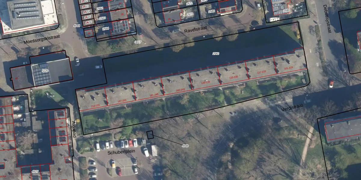 Verdistraat 165 is gelegen op kadastraal perceel LDN01O2542. Deze kadastrale aanduiding is uniek en wordt gebruikt door het Kadaster om eigendomsrechten en andere zakelijke rechten vast te leggen. Het perceel maakt onderdeel uit van de kadastrale gemeente Leiden.