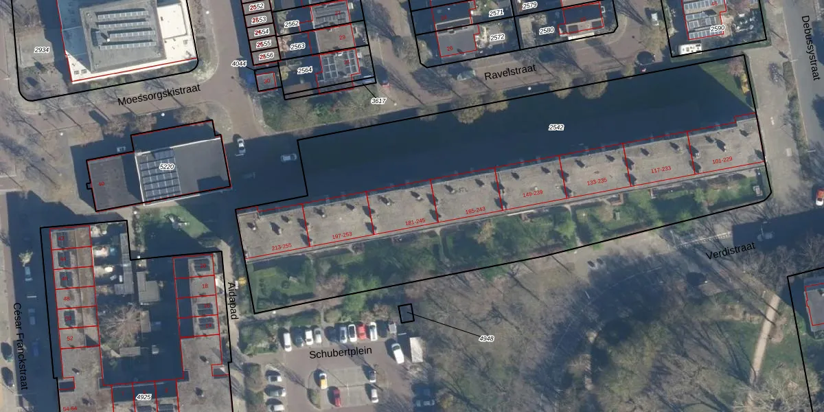 Verdistraat 185 is gelegen op kadastraal perceel LDN01O2542. Deze kadastrale aanduiding is uniek en wordt gebruikt door het Kadaster om eigendomsrechten en andere zakelijke rechten vast te leggen. Het perceel maakt onderdeel uit van de kadastrale gemeente Leiden.