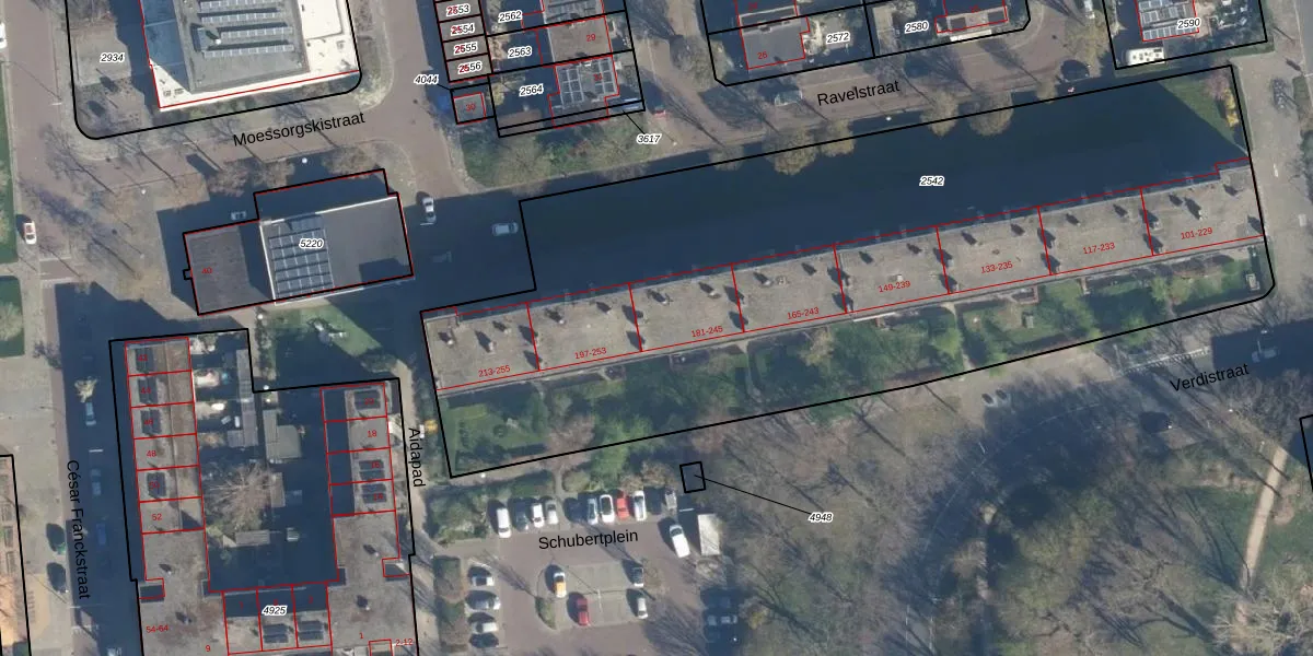 Het perceel waarop het adres ligt is LDN01-O-2542. De afkorting 'LDN01' staat voor kadastrale gemeente Leiden. De oppervlakte van het perceel is 4713 m². Dat is groter dan gemiddeld in Leiden, waar de gemiddelde perceeloppervlakte op 703,94 m² ligt. De grootste perceeloppervlakte in de kadastrale gemeente is 51,8 ha. De kleinste oppervlakte bedraagt 0 m². Op het perceel zijn 78 adressen aanwezig. De huidige grenzen van het perceel zijn digitaal in de Basisregistratie Kadaster (BRK) geregistreerd op 07-12-2007.
