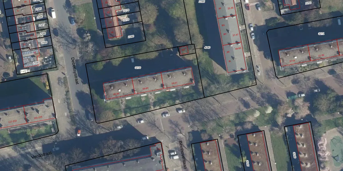 Het perceel waarop Verdistraat 61 staat heeft een oppervlakte van 2130 m². Dit is een zeer groot perceel. De perceeloppervlakte wordt geregistreerd door het Kadaster. Gedetailleerde informatie over de maten van dit perceel kunt u vinden in het rapport Kadastrale kaart met maatvoering van Verdistraat 61.