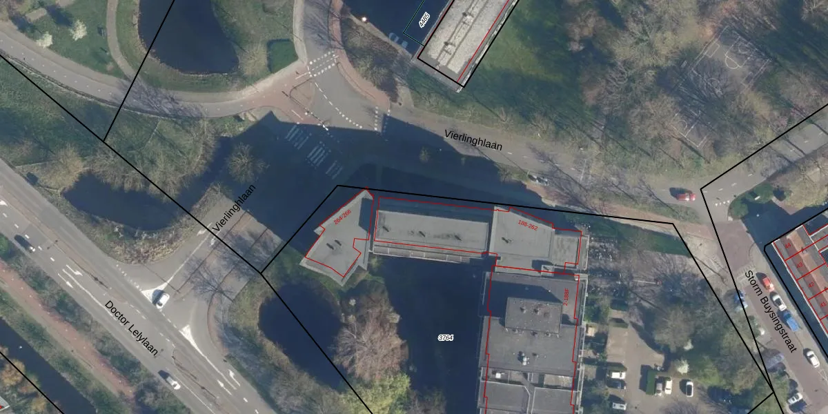 Het perceel waarop Vierlinghlaan 200 staat heeft een oppervlakte van 7165 m². Dit is een zeer groot perceel. De perceeloppervlakte wordt geregistreerd door het Kadaster. Gedetailleerde informatie over de maten van dit perceel kunt u vinden in het rapport Kadastrale kaart met maatvoering van Vierlinghlaan 200.