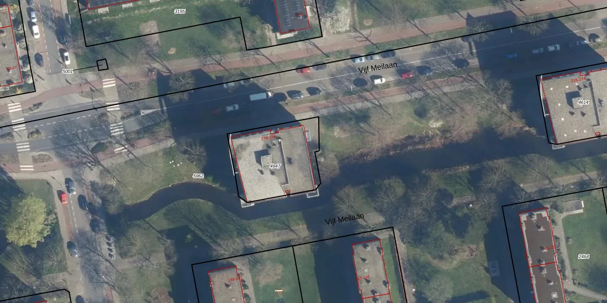 Vijf Meilaan 310 is gelegen op kadastraal perceel LDN01O4947. Deze kadastrale aanduiding is uniek en wordt gebruikt door het Kadaster om eigendomsrechten en andere zakelijke rechten vast te leggen. Het perceel maakt onderdeel uit van de kadastrale gemeente Leiden.
