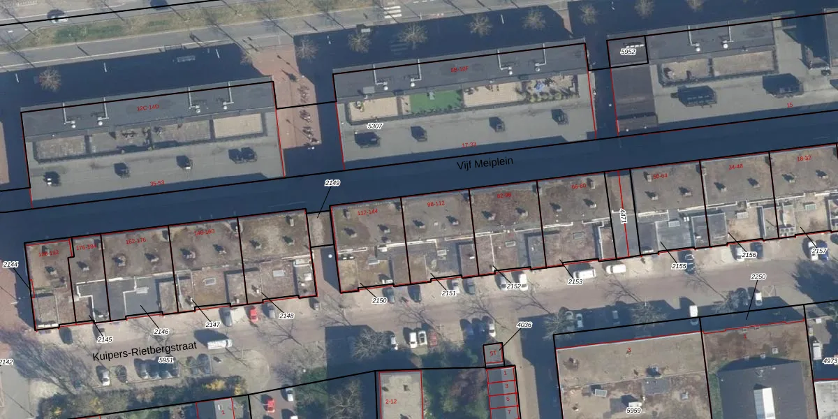 Vijf Meiplein 110 is gelegen op kadastraal perceel LDN01O2151. Deze kadastrale aanduiding is uniek en wordt gebruikt door het Kadaster om eigendomsrechten en andere zakelijke rechten vast te leggen. Het perceel maakt onderdeel uit van de kadastrale gemeente Leiden.
