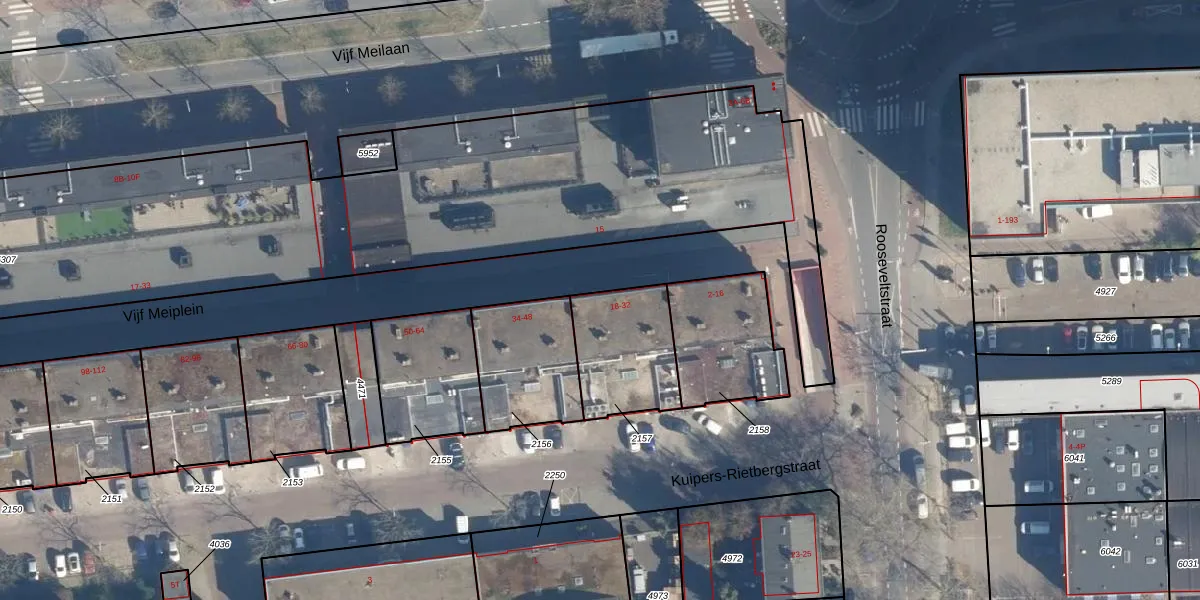 Vijf Meiplein 32 is gelegen op kadastraal perceel LDN01O2157. Deze kadastrale aanduiding is uniek en wordt gebruikt door het Kadaster om eigendomsrechten en andere zakelijke rechten vast te leggen. Het perceel maakt onderdeel uit van de kadastrale gemeente Leiden.