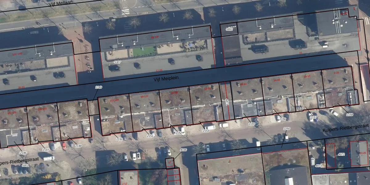 Het perceel waarop Vijf Meiplein 84 staat heeft een oppervlakte van 341 m². Dit is een groot perceel. De perceeloppervlakte wordt geregistreerd door het Kadaster. Gedetailleerde informatie over de maten van dit perceel kunt u vinden in het rapport Kadastrale kaart met maatvoering van Vijf Meiplein 84.