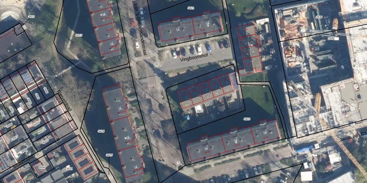 Vingboonshof 23 is gelegen op kadastraal perceel LDN01O5422. Deze kadastrale aanduiding is uniek en wordt gebruikt door het Kadaster om eigendomsrechten en andere zakelijke rechten vast te leggen. Het perceel maakt onderdeel uit van de kadastrale gemeente Leiden.