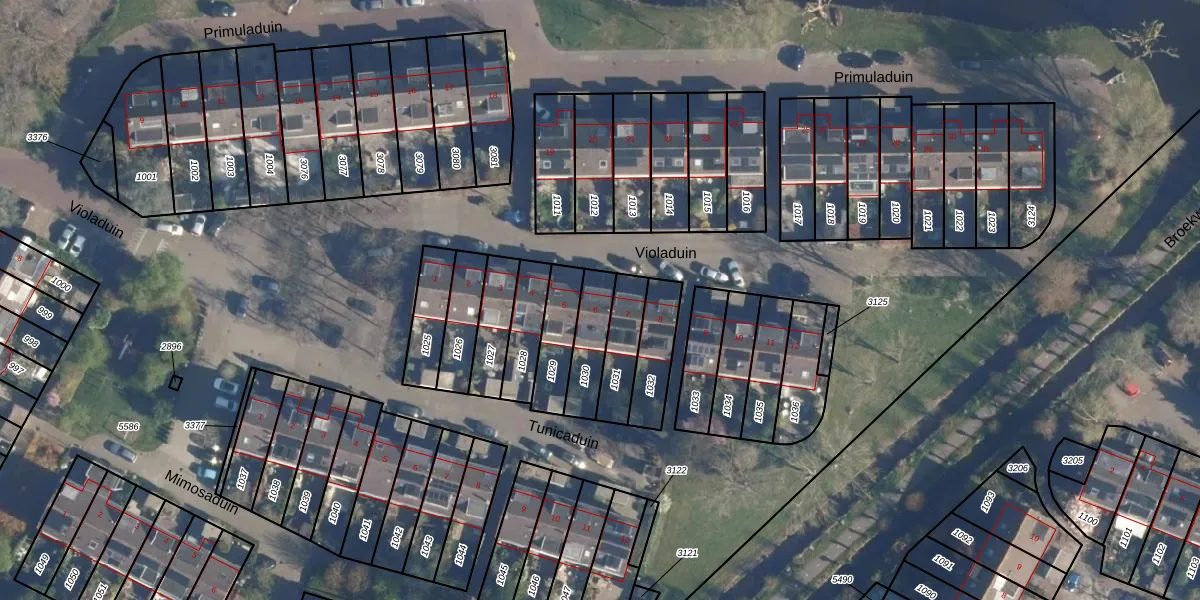 Violaduin 6 is gelegen op kadastraal perceel LDN01S1030. Deze kadastrale aanduiding is uniek en wordt gebruikt door het Kadaster om eigendomsrechten en andere zakelijke rechten vast te leggen. Het perceel maakt onderdeel uit van de kadastrale gemeente Leiden.