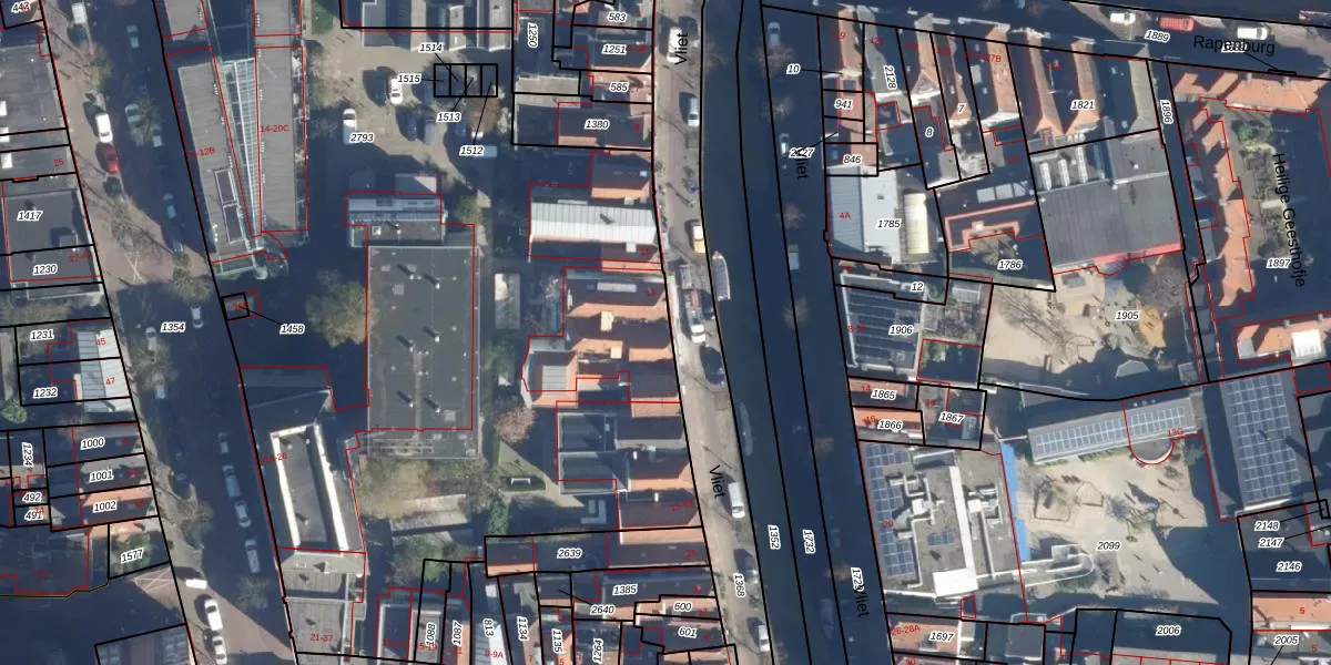 Vliet 13 is gelegen op kadastraal perceel LDN01F2793. Deze kadastrale aanduiding is uniek en wordt gebruikt door het Kadaster om eigendomsrechten en andere zakelijke rechten vast te leggen. Het perceel maakt onderdeel uit van de kadastrale gemeente Leiden.