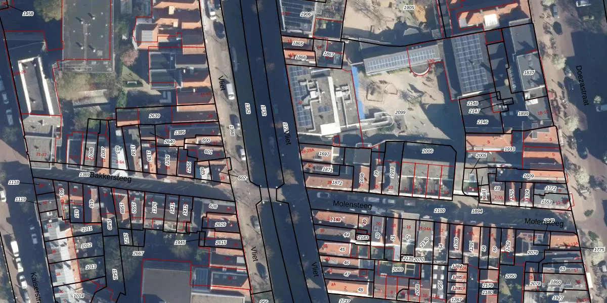 Het perceel waarop Vliet 28 staat heeft een oppervlakte van 73 m². Dit is een klein perceel. De perceeloppervlakte wordt geregistreerd door het Kadaster. Gedetailleerde informatie over de maten van dit perceel kunt u vinden in het rapport Kadastrale kaart met maatvoering van Vliet 28.