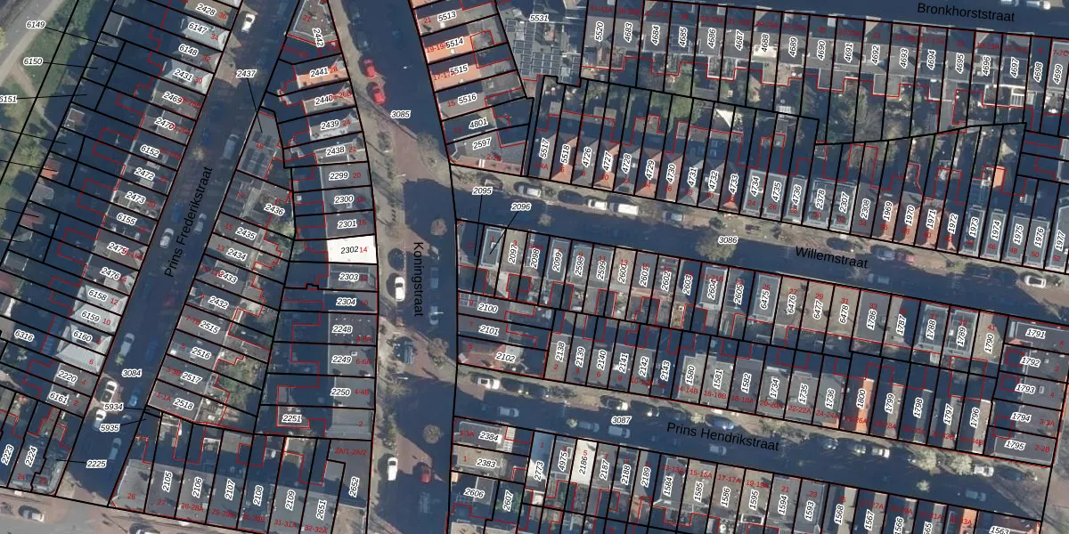 Het perceel waarop Willemstraat 5-A staat heeft een oppervlakte van 55 m². Dit is een klein perceel. De perceeloppervlakte wordt geregistreerd door het Kadaster. Gedetailleerde informatie over de maten van dit perceel kunt u vinden in het rapport Kadastrale kaart met maatvoering van Willemstraat 5-A.