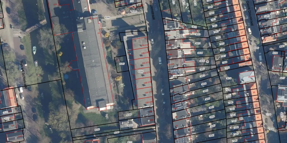 Witte Rozenstraat 25-D is gelegen op kadastraal perceel LDN01M8344. Deze kadastrale aanduiding is uniek en wordt gebruikt door het Kadaster om eigendomsrechten en andere zakelijke rechten vast te leggen. Het perceel maakt onderdeel uit van de kadastrale gemeente Leiden.