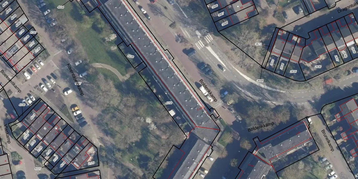 Het perceel waarop Bolderikkamp 110 staat heeft een oppervlakte van 4596 m². Dit is een zeer groot perceel. De perceeloppervlakte wordt geregistreerd door het Kadaster. Gedetailleerde informatie over de maten van dit perceel kunt u vinden in het rapport Kadastrale kaart met maatvoering van Bolderikkamp 110.