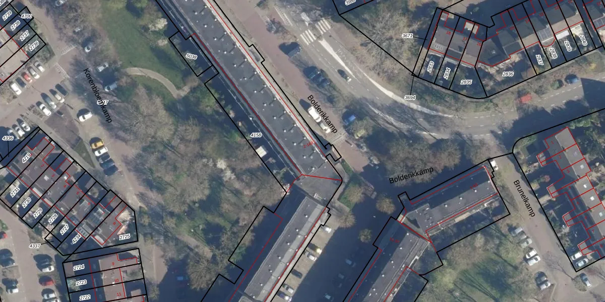 Het perceel waarop Bolderikkamp 116 staat heeft een oppervlakte van 4596 m². Dit is een zeer groot perceel. De perceeloppervlakte wordt geregistreerd door het Kadaster. Gedetailleerde informatie over de maten van dit perceel kunt u vinden in het rapport Kadastrale kaart met maatvoering van Bolderikkamp 116.