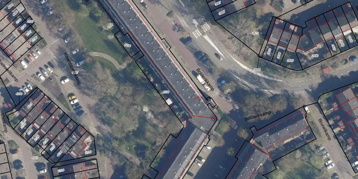 Het perceel waarop Bolderikkamp 144 staat heeft een oppervlakte van 4596 m². Dit is een zeer groot perceel. De perceeloppervlakte wordt geregistreerd door het Kadaster. Gedetailleerde informatie over de maten van dit perceel kunt u vinden in het rapport Kadastrale kaart met maatvoering van Bolderikkamp 144.
