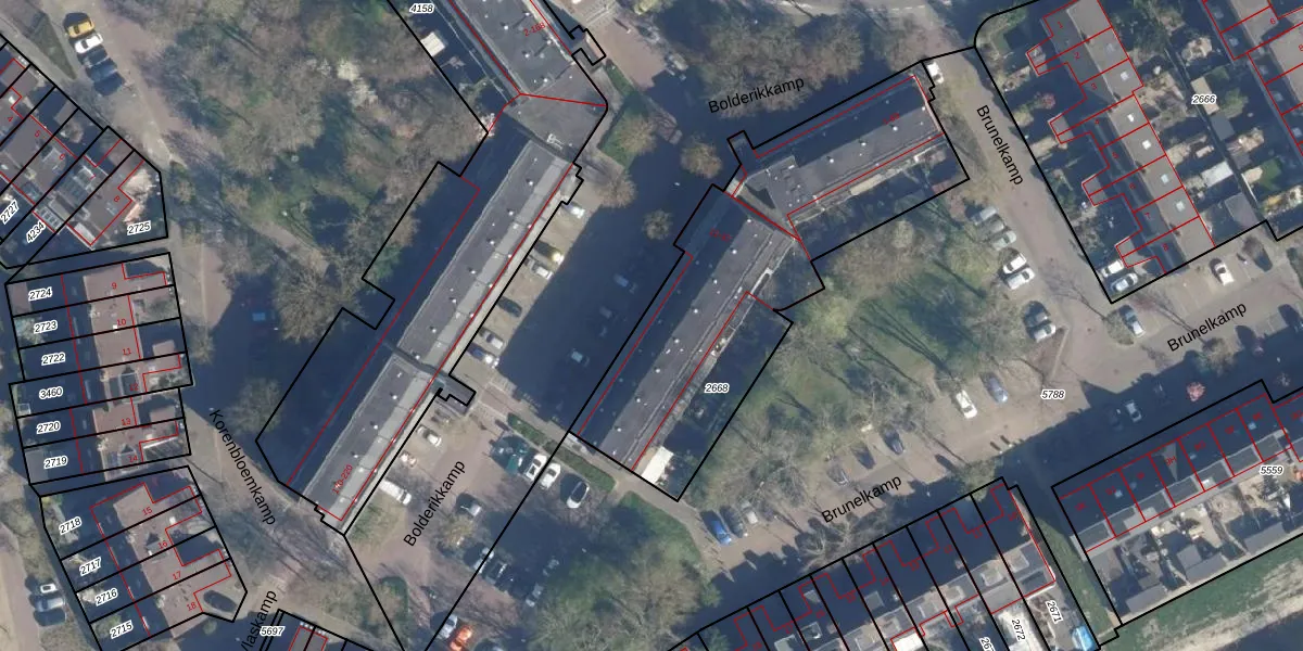 Bolderikkamp 15 is gelegen op kadastraal perceel LDD00B2668. Deze kadastrale aanduiding is uniek en wordt gebruikt door het Kadaster om eigendomsrechten en andere zakelijke rechten vast te leggen. Het perceel maakt onderdeel uit van de kadastrale gemeente Leiderdorp.