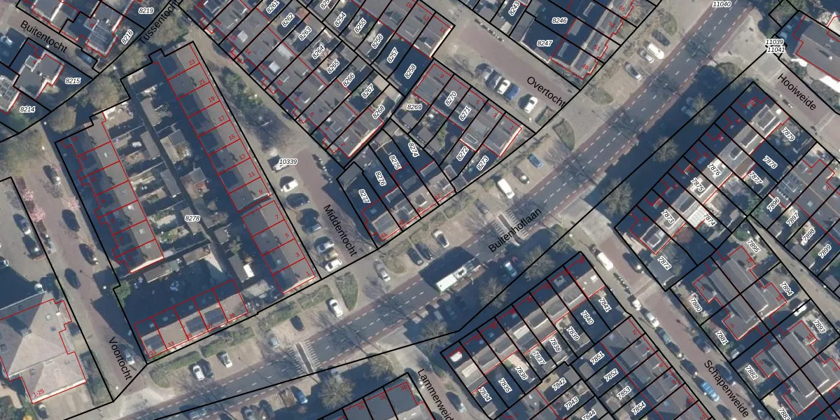 Buitenhoflaan 45 is gelegen op kadastraal perceel LDD00A8275. Deze kadastrale aanduiding is uniek en wordt gebruikt door het Kadaster om eigendomsrechten en andere zakelijke rechten vast te leggen. Het perceel maakt onderdeel uit van de kadastrale gemeente Leiderdorp.