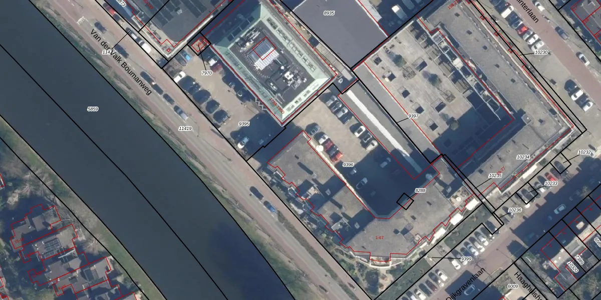 Het perceel waarop het adres ligt is LDD00-A-9396. De afkorting 'LDD00' staat voor kadastrale gemeente Leiderdorp. De gemiddelde perceeloppervlakte in de kadastrale gemeente Leiderdorp is 1286,62 m². Dit perceel is met zijn 2898 m² dus groter dan gemiddeld. De grootste perceeloppervlakte in de kadastrale gemeente is 43,4 ha. De kleinste oppervlakte bedraagt 0 m². Op het perceel zijn 34 adressen aanwezig. De huidige grenzen van het perceel zijn digitaal in de Basisregistratie Kadaster (BRK) geregistreerd op 22-08-2003.