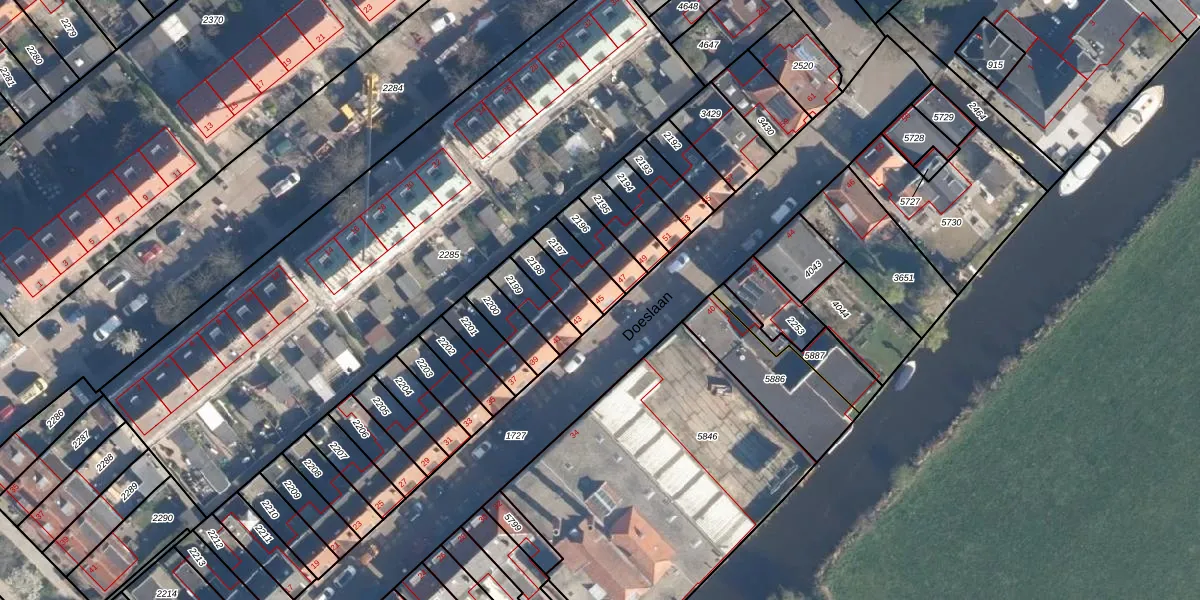Doeslaan 45 is gelegen op kadastraal perceel LDD00B2197. Deze kadastrale aanduiding is uniek en wordt gebruikt door het Kadaster om eigendomsrechten en andere zakelijke rechten vast te leggen. Het perceel maakt onderdeel uit van de kadastrale gemeente Leiderdorp.