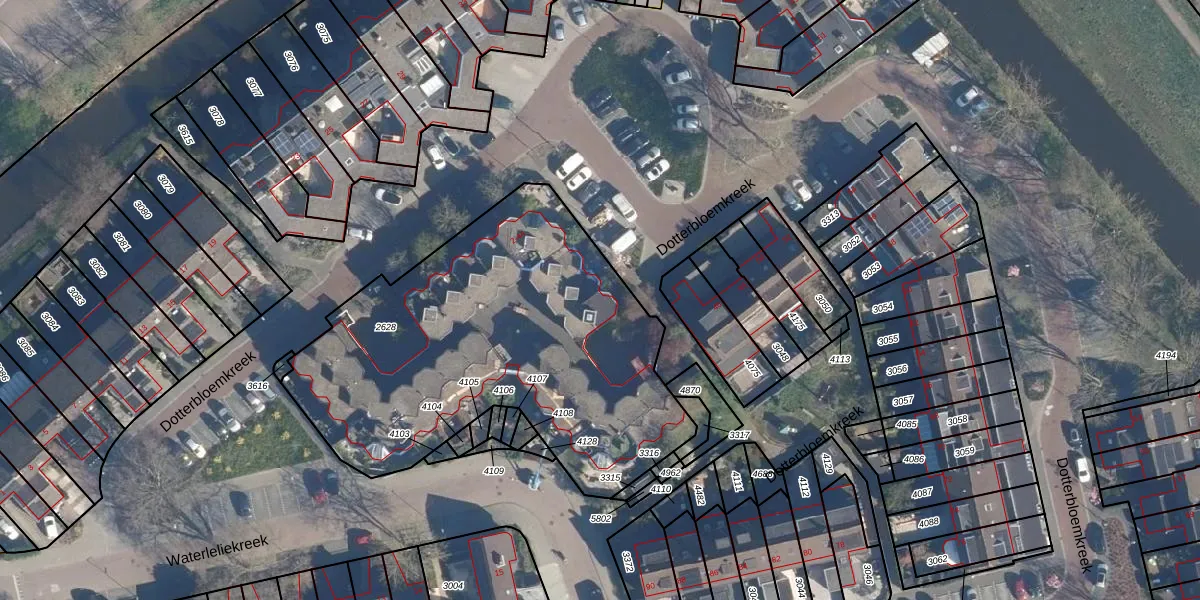 Dotterbloemkreek 32 is gelegen op kadastraal perceel LDD00B2628. Deze kadastrale aanduiding is uniek en wordt gebruikt door het Kadaster om eigendomsrechten en andere zakelijke rechten vast te leggen. Het perceel maakt onderdeel uit van de kadastrale gemeente Leiderdorp.