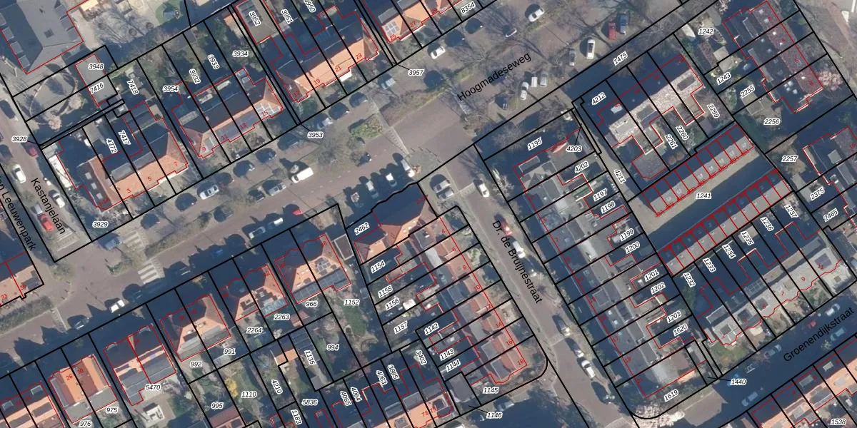 Dr. de Bruijnestraat 2 is gelegen op kadastraal perceel LDD00B2462. Deze kadastrale aanduiding is uniek en wordt gebruikt door het Kadaster om eigendomsrechten en andere zakelijke rechten vast te leggen. Het perceel maakt onderdeel uit van de kadastrale gemeente Leiderdorp.