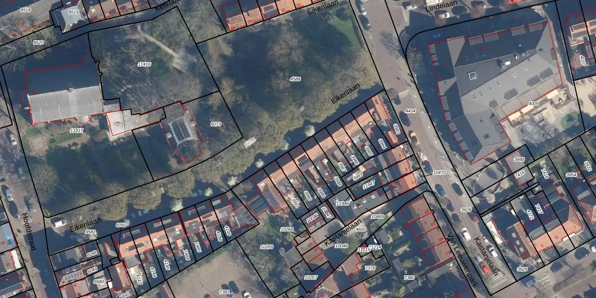Eikenlaan 7 is gelegen op kadastraal perceel LDD00A3989. Deze kadastrale aanduiding is uniek en wordt gebruikt door het Kadaster om eigendomsrechten en andere zakelijke rechten vast te leggen. Het perceel maakt onderdeel uit van de kadastrale gemeente Leiderdorp.